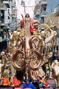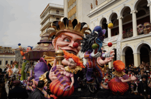 Excitement and anticipation fill the air. And then it all begins! The exquisite floats open the parade impressing everyone with the creativity, imagination and the sense of humor of their creators. The Carnival Queen on her own magnificent float, dances smiling and waving to people who get really excited. The Carnival Groups follow, some of them having their own impressive floats. At the same time a national broadcast takes place so all people in Greece become part of the fun and the festive mood. The parade ends in the sweetest way; loads of chocolate bars are, in a way, “thrown” to our visitors from the last float. It is real magic either joining the parade or just watching it. No one stands still; everybody dances to the rhythm of the carnival songs and music.